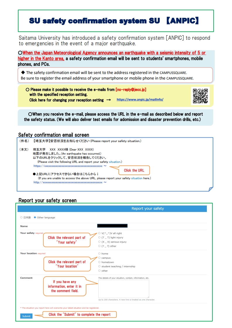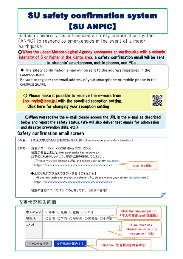 When the Japan Meteorogical Agenct announces an earthquake with a seismic intensityof 5 or higher in Kanto area, a safety confirmation *email will be sent to each SU student. When you receive the e-mail, please accecc the URL in the e-mail and report your safety status.